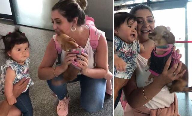 Chihuahua (Çivava) cinsi 1,5 yaşındaki 'Barbie' adlı dişi köpeğin, 15 gün ayrı kaldığı sahipleriyle havalimanındaki buluşma anı, görenlerin içini ısıttı.