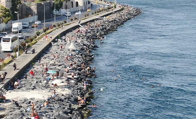 Hafta sonunda sıcak havadan bunalanlar Sarayburnu Sahil'de denize girdi. Sahilde yoğunluk olduğu görülürken, kalabalık havadan da görüntülendi.