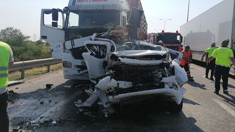 Kaza, saat 16.45 sıralarında TEM Otoyolu Selimpaşa mevkiinde yaşandı. Bölgede araç yangını nedeniyle yavaşlayan trafikte TIR önündeki hafif ticari araca çarpıp sürükledi. Hafif ticari araç TIR ile önündeki hafriyat kamyonunu arasında ezildi. Hafif ticari araçtaki 5 kişi bulundukları yerde sıkışarak yaralandı. Haber verilmesi üzerine olay yerine sağlık, itfaiye ve jandarma ekipleri sevk edildi. Araçta sıkışanlar itfaiye ekipleri tarafından kurtarılarak sağlık ekiplerine teslim edildi. Yaralılar ilk müdahalesinin ardından çevredeki hastanelere kaldırıldı. Kaza nedeniyle bölgede kilometrelerce araç kuyruğu oluştu.