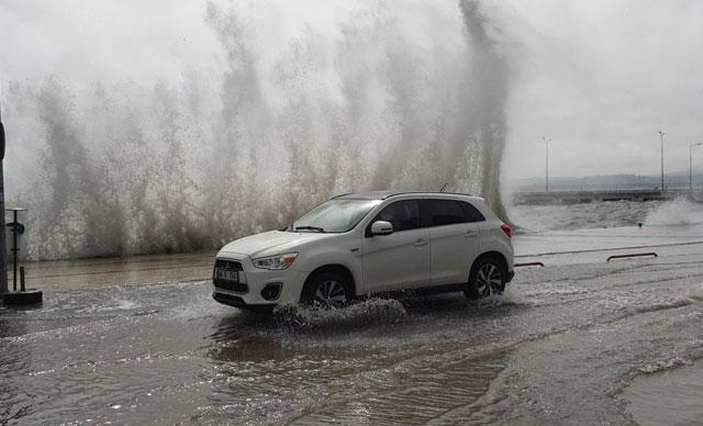 Saatte 30 kilometre hızla esen rüzgarın taşıdığı dalgaların bir anda yolu kapladığını gören sürücüler zor anlar yaşadı. Yaşanan paniği çevredeki vatandaşlar da cep telefonu kamerasıyla kayda aldı.