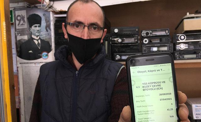 Sinop'ta esnaflık yapan Seyfettin Aksan, 3 gün önce e-postalarına bakarken 57 AR 204 plakalı aracına ceza ihbarı geldiğini gördü. Ceza makbuzunu inceleyen Aksan, cezanın yazıldığı yerin İstanbul'da Yavuz Sultan Selim Köprüsü olduğunu görünce şoke oldu. Yavuz Sultan Selim Köprüsü ve Kuzey Çevre Otoyolu’ndan 3 kez geçiş ihlali gerekçesiyle 41 lira ceza kesilen Aksan, İstanbul’a 15 yıl önce gittiğini belirterek, konunun takipçisi olacağını anlattı.