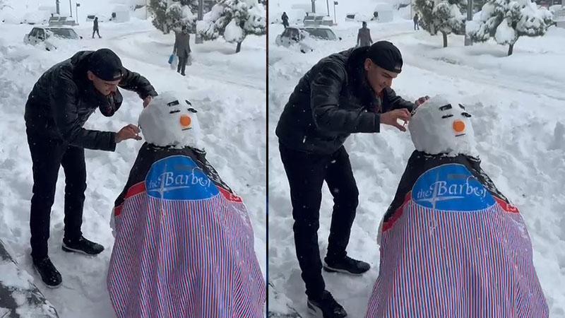 Şırnak’ta erkek kuaförü Halil Atak, yaptığı kardan adamı mesleğine uygun şekilde tıraş ederek kendisini izleyenlere keyifli anlar yaşattı.