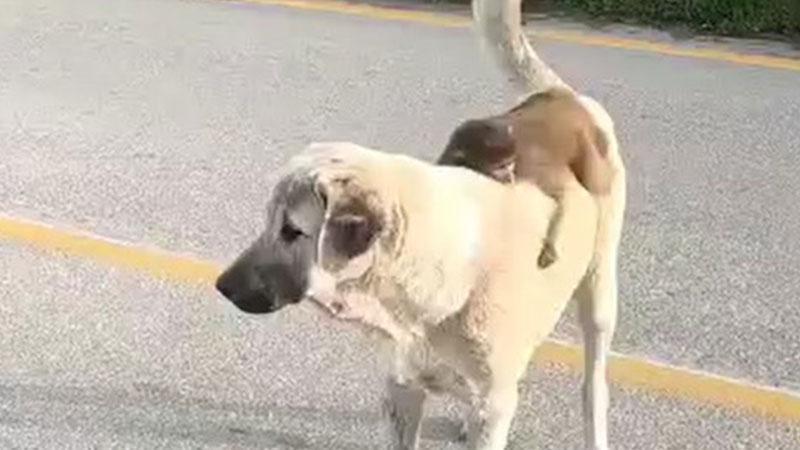 Uludağ Yolu’nda yürüyen vatandaşlar, bir sokak köpeğinin sırtına çıkıp, ona sarılarak gezen maymunu görünce o anları cep telefonu kamerasıyla görüntüledi. Köpeğe sıkı sıkı tutunup, bir an olsun bırakmayan maymun, yanına bir vatandaşın yaklaşmasıyla kaçarak, gözden kayboldu.