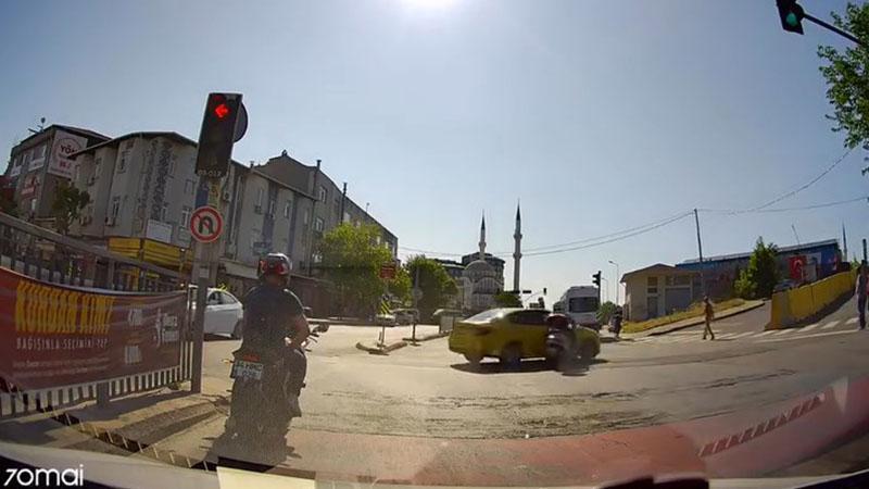 Şişli'de cadde üzerinde seyreden motosiklet sürücüsü karşı yönden U dönüşü yapan taksi ile çarpıştı. Kaza sonrası motosiklet sürücüsü yaralanırken, kaza anı yoldan geçen bir otomobilin kamerasına yansıdı.