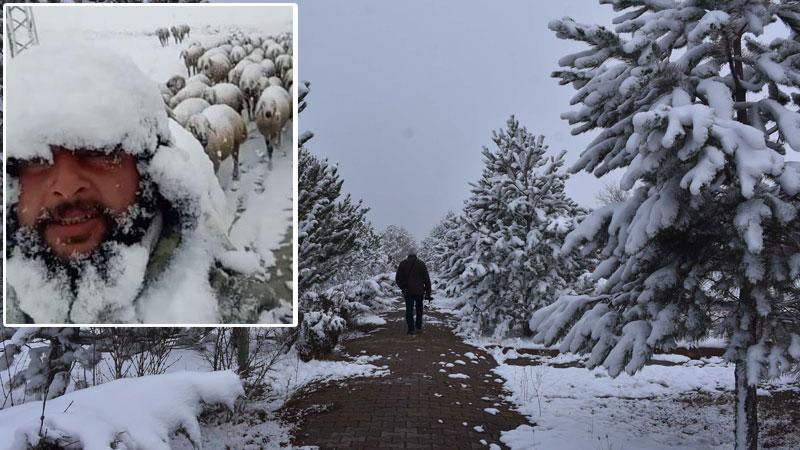Sivas'ın Ulaş ve Altınyayla ilçelerinde kar yağışı etkili oldu. Altınyayla ilçesinde arazide hayvanlarıyla kara yakalanan çoban, o anları cep telefonuyla kaydetti.