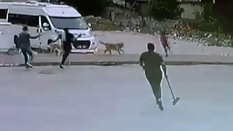 Korkup, kaçan çocuğu fark eden esnaf, tahta sopalarla yardımına koştu. Çocuğun üzerine koşmaya devam eden köpekler, esnafın müdahalesiyle uzaklaştırıldı. Çocuğun, köpeklerin saldırısından son anda kurtulduğu anlar bir iş yerinin güvenlik kamerasına yansıdı.