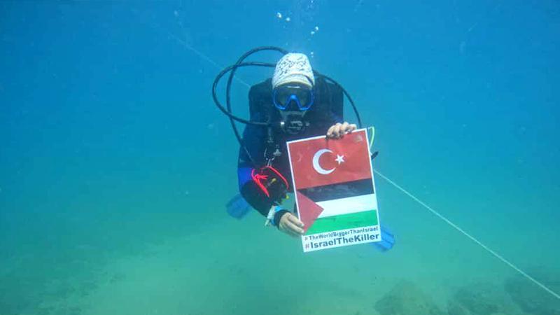 Su altında işaret diliyle Gazze eylemi
