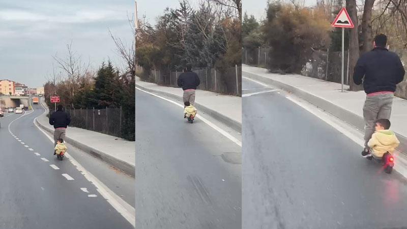 Görüntüler, dün öğle saatlerinde Yunus Emre Mahallesi Adem Yavuz Caddesi'nde kaydedildi. Araç trafiğinin yoğun olduğu caddede bir kişi, elektrikli skuterın arkasına küçük çocuğunu da alarak ilerlemeye başladı. Trafikte tehlikeli şekilde ilerleyen sürücüyü fark eden başka bir araç sürücüsü, o anları cep telefonu kamerasıyla görüntüledi.