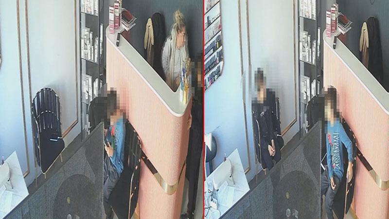 Güzellik merkezindeki para hırsızlığı iş yerinin güvenlik kamerasıyla kaydedildi. Görüntülerde, güzellik merkezine gelen kadının kasadaki paraları çalması ve çocukları iterek kaçtığı anlar yer aldı.