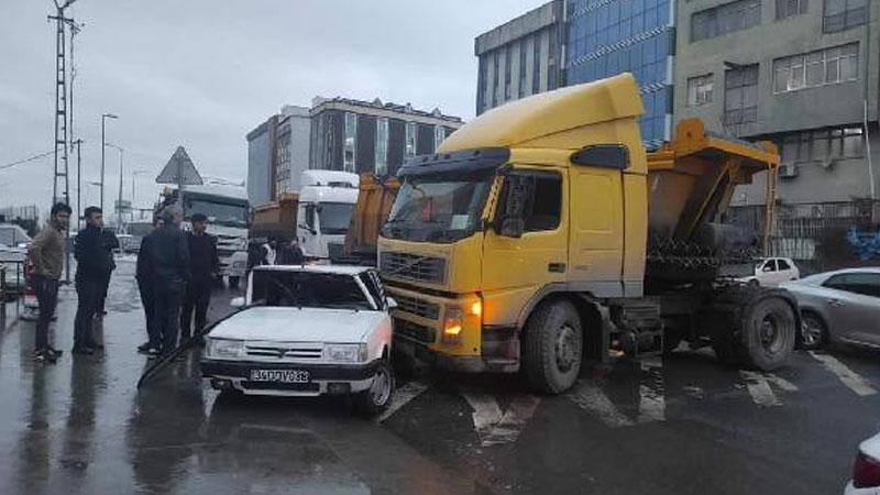 Sultangazi'de hafriyat kamyonu otomobile çarptı, kaldırımda yürüyen yaya ölümden döndü