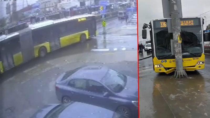 Sultangazi'de İETT otobüsü yola dökülen akaryakıt nedeniyle kayarak direğe çarptı