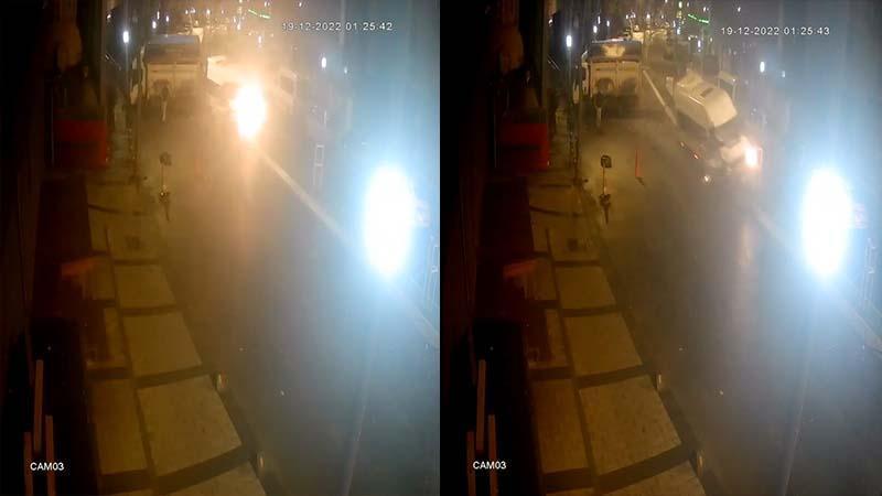 Yaşanan kaza bir iş yerinin güvenlik kamerası kayıtlarına girdi. Görüntülerde, seyir halindeki minibüsün, park halindeki kamyonete çarparak, refüje çıktığı, yolda yürüyen bir kişinin kazayı saniyelerle atlattığı görülüyor. Kaza sonrası yolda yürüyen kişinin sakinliğini koruyarak yürümeye devam ettiği, mahalle sakinlerinin ise şoförün yardımına koştuğu anlar kamera kayıtlarına girdi.