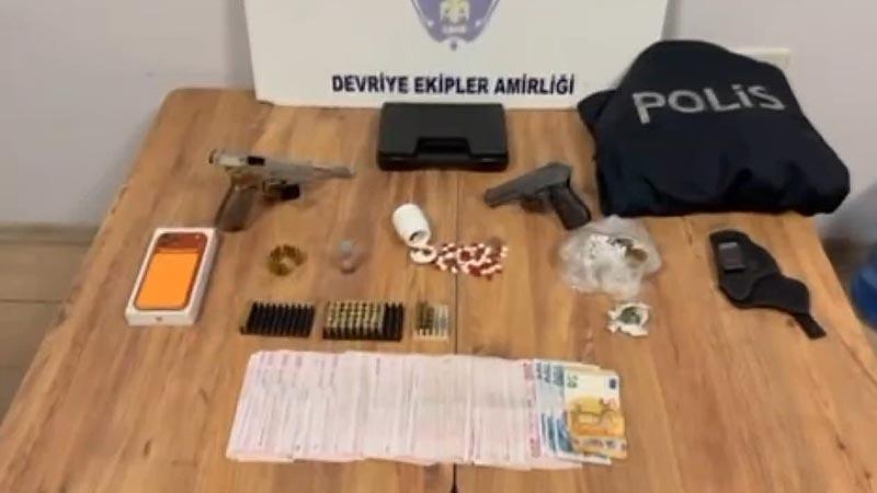 Düzenlenen operasyonda Z.K. (57), H.B. (36) isimli kadınlar ile İ.K. (34) ve K.İ. yakalanarak gözaltına alındı. Adreste yapılan aramalarda 44 narkotik hap, 39 gram narkotik maddeli tütün, ruhsatsız tabanca, kurusıkı tabanca, 24 fişek, 5 kovan, tüfek kartuşu, silah kılıfı, polis montu, 33 bin 300 lira, 50 euro ve cep telefonu ele geçirildi.