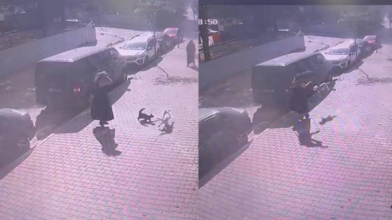 Olay, geçtiğimiz günlerde öğle saatlerinde, Eski Habipler Mahallesi'nde meydana geldi. Sokakta yürüyen kadın ve köpeğe, sokak kedisi saldırdı. Kadının kafasına kadar tırmanan kedi, kadından uzaklaşan köpeğe saldırmayı sürdürdü. Bu sırada oradan geçen kişi ise kediyi engellemeye çalıştı. Kadın köpeğini alarak uzaklaştı. O anlar bir iş yerinin güvenlik kamerasına yansıdı.