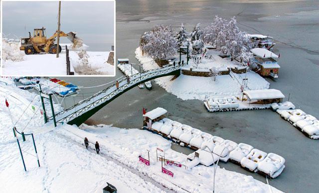 Konya'nın Beyşehir ilçe merkezinde iş makinesiyle toplanan karlar, kamyonlara yüklenip kuraklık nedeniyle kuruma tehlikesiyle karşı karşıya kalan Beyşehir Gölü'ne götürülerek döküldü.