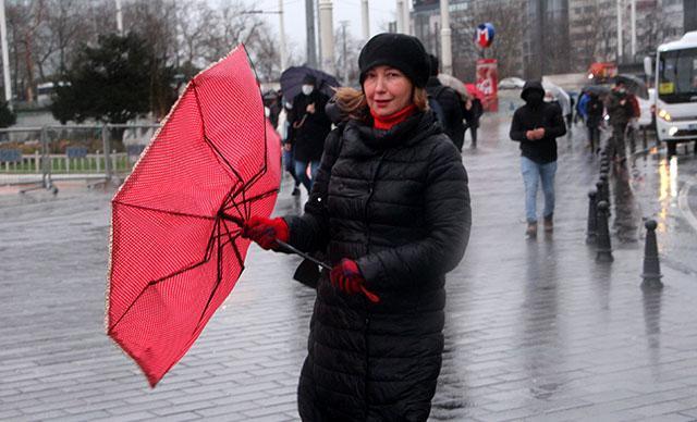 İstanbul'da gece saatlerinden itibaren etkisini sürdüren yağmur ve rüzgar zor anlar yaşattı. Taksim Meydanı’nda sert esen rüzgar nedeniyle birçok kişinin şemsiyesi ters döndü.