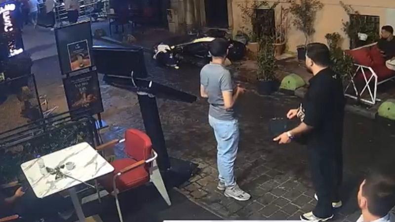 Taksim’de kapısının önüne park edilen motosiklete önce çorba döktü sonra tekme attı