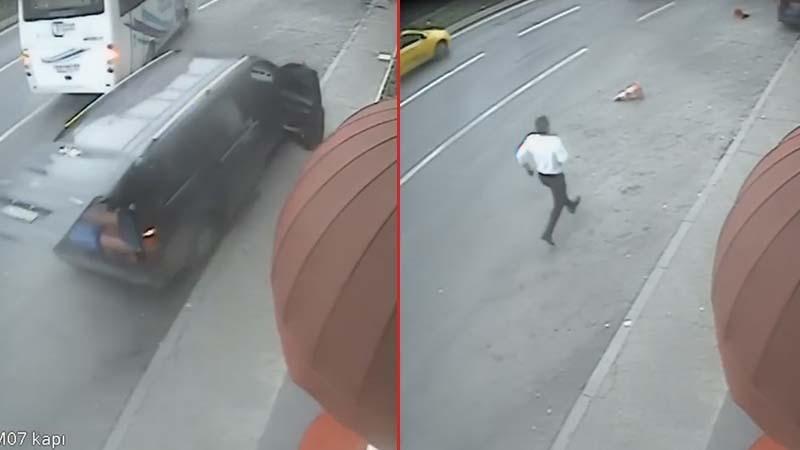 Minibüste bulunan yolcular kazadan yara almadan kurtulurken, araç kullanılamaz hale geldi. Kaza anı ise güvenlik kamerasına saniye saniye yansıdı. Görüntülerde minibüsün kapısı açık şekilde hareket ettiği anlar görülüyor. Minibüs metrelerce kayarak kaldırıma çıkıyor ardından da kaldırımdaki ağaça çarparak duruyor. Kazanın ardından ihbar üzerine olay yerine polis ekibi sevk edildi. İnceleme yapan polis ekipleri kazayla ilgili rapor tuttu.