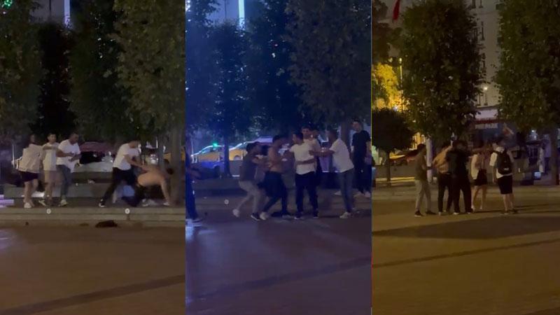 Taksim Meydanı’nda 2 kişi henüz bilinmeyen bir nedenle kavgaya etmeye başladı. Tekmeli yumruklu kavgayı çevredekiler ve 1 kadın ayırmaya çalıştı. Kavgayı ayırmaya çalışan kadının da yumruklara maruz kaldığı kavga sırasında 2 kişi dengesini kaybedip yere düştü. Yerde de bir süre devam eden kavga anları cep telefonu kamerasına yansıdı.