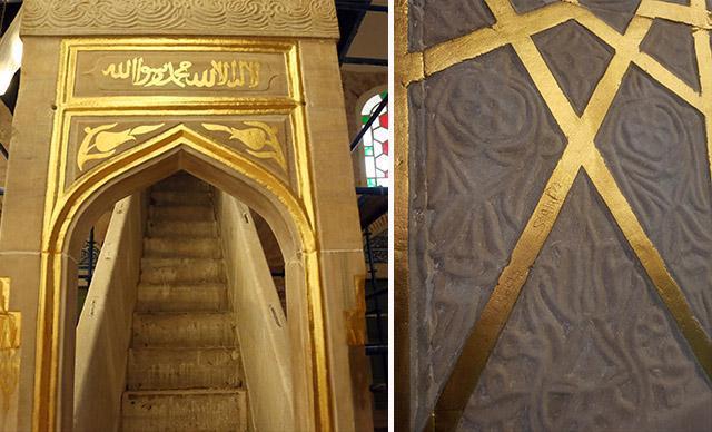 Kadınlar mahfilinde kayıp olan iki beyitin de ortaya çıktığı restorasyonda, büyük tahribata uğrayan ve üzerlerinde 'Allah', 'Hz. Muhammed', 'Hz. Ebubekir', 'Hz. Ömer', 'Hz. Osman' ve 'Hz. Ali' yazılı hat eserlerdeki çatlaklar, Mersin balığından elde edilen tutkalla düzenlendi.