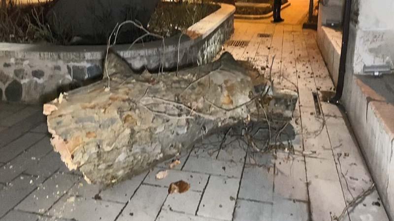 Görüntülerde; çınarın kökünden çıkıp, yanındaki caminin duvarına çarparak hasar verdiği, bir parçasının da beton zemine düştüğü anlar yer aldı.