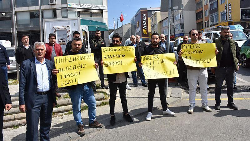 Çerkezköy'ün Kızılpınar Mahallesi'nde 40 taksici, 4 yıl önce Tekirdağ Büyükşehir Belediyesi'nin encümen kararıyla durak hakkı kazandı. Sürecin devamında Büyükşehir Belediyesi'nin izin belgelerini vermediğini belirten taksiciler, durumu yargı yoluna taşıdı. Taksiciler, kazandıkları davaya Büyükşehir Belediyesi'nin itiraz ederek, yürütmeyi durdurma kararı aldırdığını belirterek, haklarının verilmesi için belediye önünde eylem yaptı.