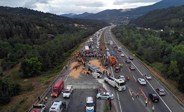 Kaza nedeniyle ulaşıma kapanan TEM Otoyolu'nun İstanbul istikametinde kilometrelerce araç kuyruğu oluştu. Kamyonda yüklü toprak ile TIR’da yüklü mısır yola döküldü. Karayolları ekiplerinin kaza yapan araçları kaldırma çalışmaları sürüyor.