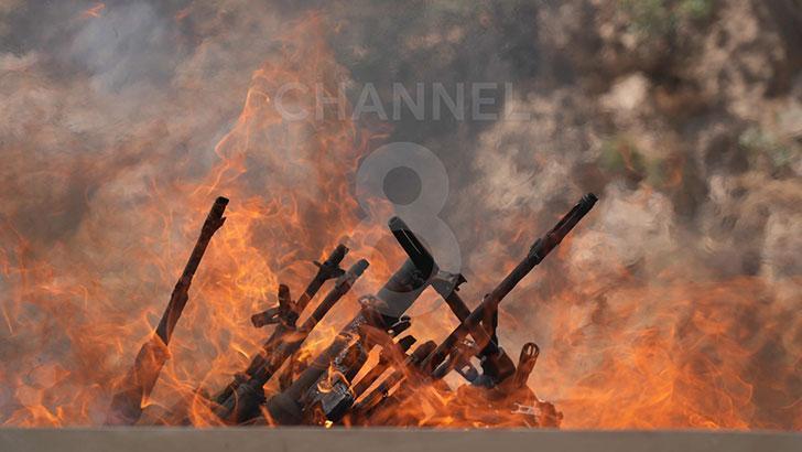Daha sonra silahlar ateşe verilip, imha edildi. Silahların imha edildiği alanın çevresinde geniş güvenlik önlemi alındı, bir helikopter havadan alanın etrafında sürekli tarama yaptı.