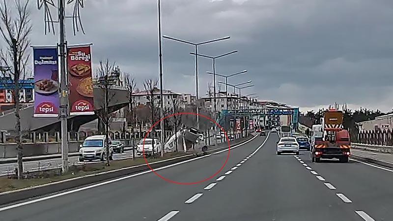 Öte yandan kaza, bir başka aracın kamerasına yansıdı. Görüntülerde; otomobilin trafikte zikzak çizerek refüjde ters döndüğü, arka sol tekerinin araçtan ayrılarak yola savrulduğu görüldü.