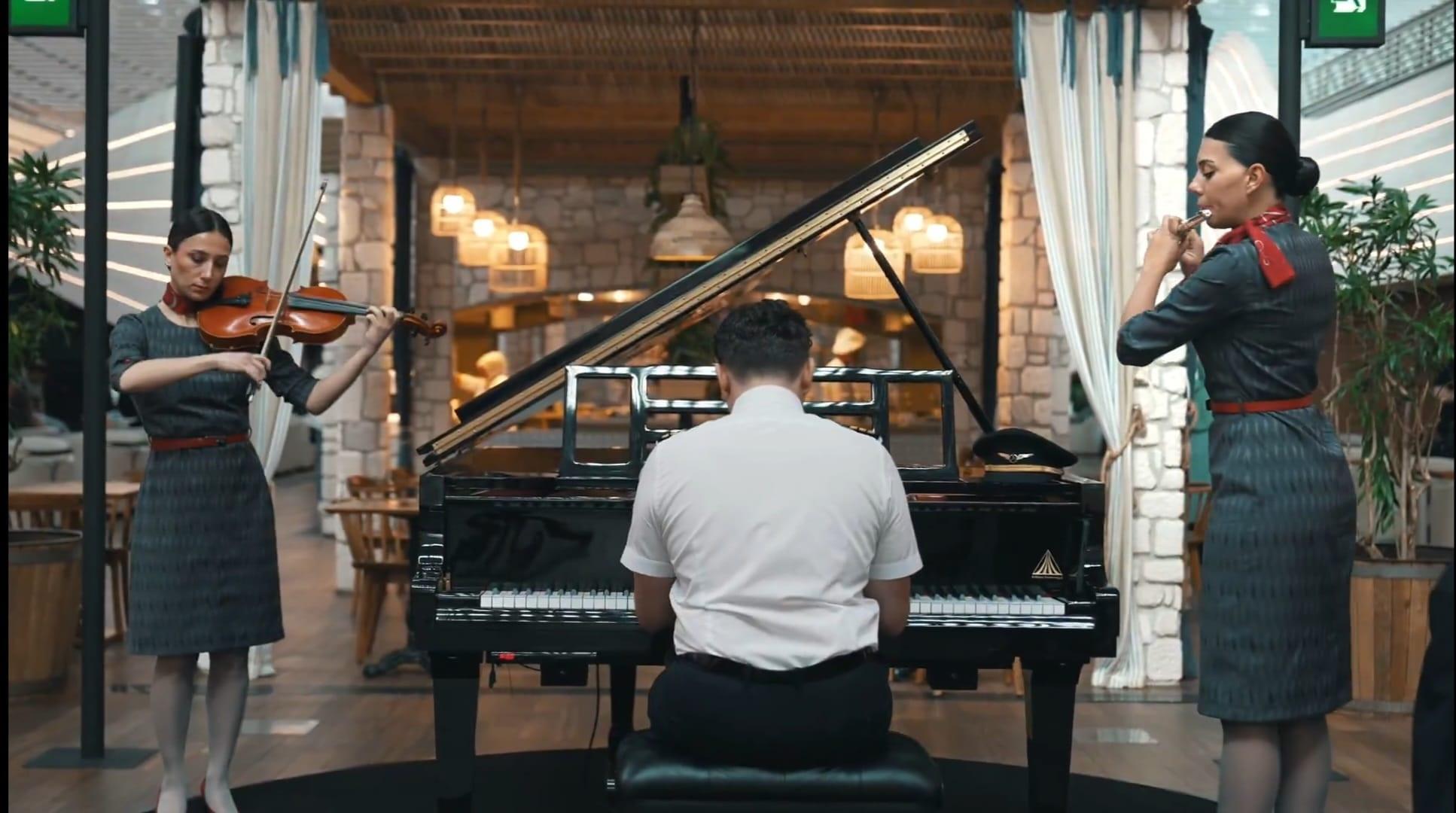 Türk Hava Yolları uçuş ekibinden yolcuları şaşırtan sürpriz. Piyanoyla gençlik marşını çalmaya başlayan THY pilotu İbrahim Levent Duran’a kemanıyla kabin memuru İmce Eylül Işık ve flütle Ece Su Acar eşlik etti.