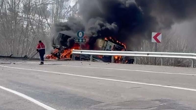 TIR devrildi, üzerindeki iş makinesi alev aldı; 3 yaralı