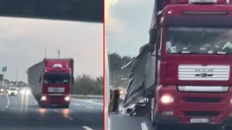 Kuzey Marmara Otoyolu'nda zikzak çizerek ilerleyen yabancı plakalı TIR'ın taşıdığı yükler yola savruldu. Trafikteki diğer sürücüler ise şoföre tepki gösterdi. O anlar cep telefonu ile kaydedildi.
