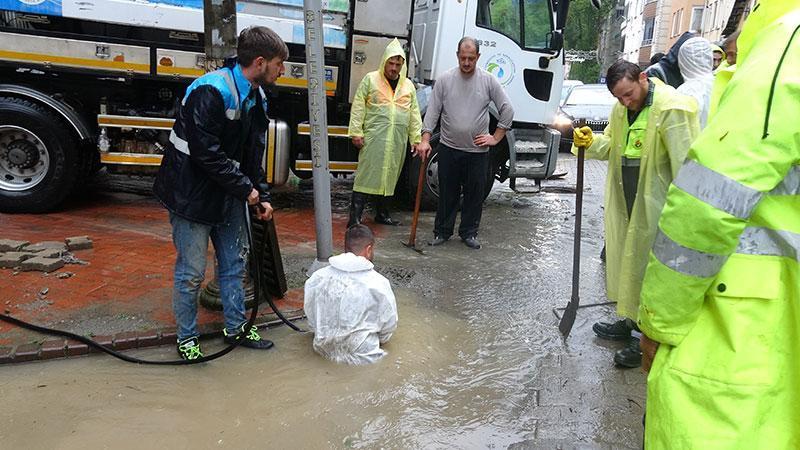 Trabzon’un Sürmene ilçesinde etkili olan sağanak yağışın ardından cadde ve sokaklarda su taşkınları meydana geldi. Yağış nedeniyle kapanan kanalizasyon kanalları, belediye ekiplerinin müdahalesiyle açıldı.