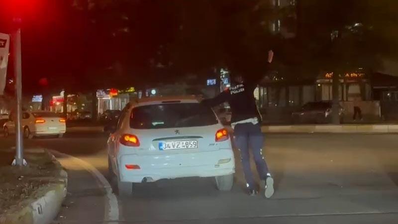 Diyarbakır'da kırmızı ışıkta arıza yapan otomobil, kavşakta görevli trafik polisi tarafından itilerek güvenli alana çekildi.