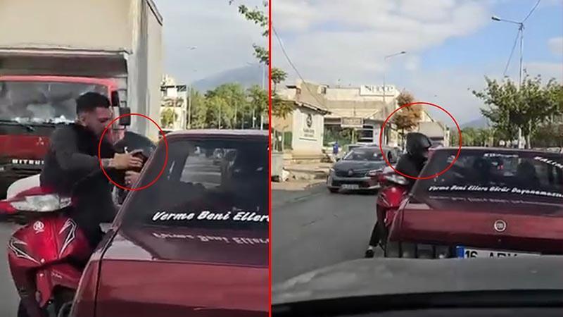 Bursa’da otomobil sürücüsü, yol verme kavgasında motosiklet sürücüsünün kaskını aldı. O anlar cep telefonu kamerasıyla görüntülendi.