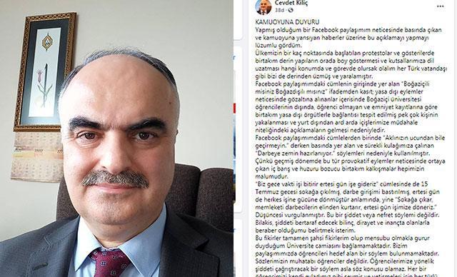 Trakya Üniversitesi İlahiyat Fakültesi Dekanı ve Üniversite Genel Sekreteri Prof. Dr. Cevdet Kılıç, sosyal medya hesabı üzerinden Boğaziçi Üniversitesi'ndeki protestolara ilişkin yaptığı paylaşımlarlarla ilgili basında çıkan ve kamuoyuna yansıyan haberler üzerine bir açıklama yaptı. Kılıç, sosyal medya hesabı üzerinden 'Kamuoyuna duyuru' başlığını taşıyan açıklamada şu ifadeleri kullandı; "Ülkemizin bir kaç noktasında başlatılan protestolar ve gösterilerde birtakım derin yapıların orada boy göstermesi ve kutsallarımıza dil uzatması hangi konumda ve görevde olursak olalım her Türk vatandaşı gibi bizi de derinden üzmüş ve yaralamıştır. Facebook paylaşımımdaki cümlenin girişinde yer alan 'Boğaziçili misiniz Boğazdışılı mısınız' ifademden kasıt; yasa dışı eylemler neticesinde gözaltına alınanlar içerisinde Boğaziçi Üniversitesi öğrencilerinin dışında, öğrenci olmayan ve emniyet kayıtlarına göre birtakım yasa dışı örgütlerle bağlantısı tespit edilmiş pek çok kişinin yakalanması ve yurt dışından art arda içişlerimize müdahale niteliğindeki açıklamaların gelmesi nedeniyledir. Facebook paylaşımımdaki cümlelerden birinde 'Aklınızın ucundan bile geçirmeyin' derken basında yer alan ve sürekli kulağımıza çalınan 'Darbeye zemin hazırlanıyor' söylemleri nedeniyle kullanılmıştır. Çünkü geçmiş dönemde bu tür provokatif eylemler neticesinde ortaya çıkan iç barış ve huzuru bozucu birtakım kalkışmalar hepimizin malumudur. 'Biz gece vakti işi bitirir ertesi gün işe gideriz' cümlesinde de 15 Temmuz gecesi sokağa çıkılmış, darbe girişimi bastırılmış, ertesi gün de herkes işine gücüne dönmüştür anlamında, yine, 'Sokağa çıkar, memleketi darbecilerin elinden kurtarır, ertesi gün işimize döneriz' Düşüncesi vurgulanmıştır. Bu bir şiddet veya nefret söylemi değildir. Bilakis, şiddeti bertaraf edecek bilinç, dirayet ve inançta olanlarla beraber olduğumu belirtmek isterim."
