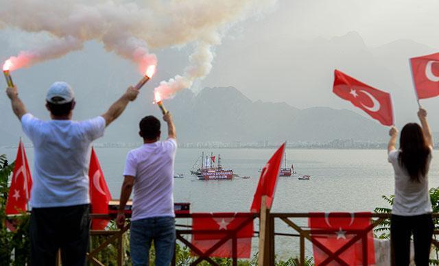 Muratpaşa Belediyesi, 19 Mayıs Atatürk'ü Anma, Gençlik ve Spor Bayramı'nı bu yıl denizden kutladı. Tarihi Kaleiçi yat limanından Türk bayrakları, Atatürk posterleriyle donatılan 3 tekne, Antalya'nın falezler bandı boyunca tur atarak vatandaşların 19 Mayıs'ını kutladı. '19 Mayıs Bayramımız kutlu olsun', 'Her yer Samsun 1919' ve 'Güzel günler göreceğiz' yazılı pankartlar asılı tekneler saat 17.30 sularında marşlar eşliğinde Kaleiçi yat limanından demir aldı. Belediye Başkanı Ümit Uysal da teknelerden birine binerken üç tekne yat limanı açıklarında 100 metrelik Türk bayraklarını açtı. Akdeniz, Muratpaşa Belediyesi'nin tekneleriyle 19 Mayıs'ta bambaşka bir görünüme bürünürken Antalyalılar da balkonlarından, yol kenarlarından bayraklar ve meşalelerle tekneleri selamladı.