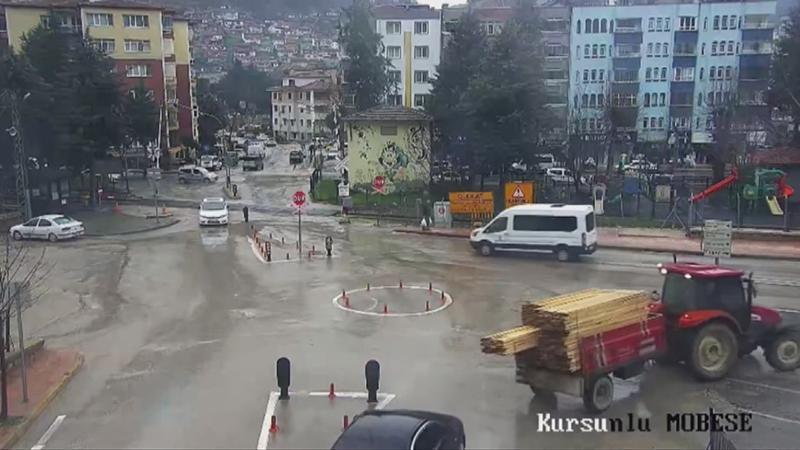 Amasya’da tünel çıkışında kavşağa hızlı giren traktörün kalas yüklü römorku devrildi. Kalasların yola savrulduğu kaza, güvenlik kamerasına yansıdı.