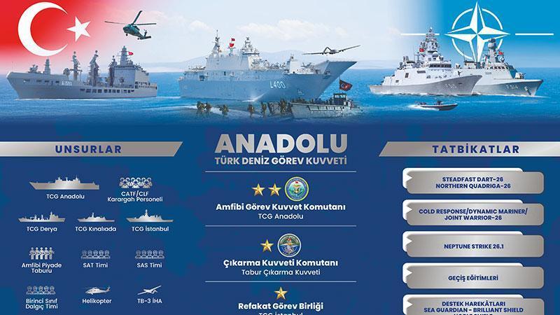 Milli Savunma Bakanlığı'nın sanal medya hesabından yapılan açıklamada, "NATO Müttefik Reaksiyon Kuvveti bünyesindeki NATO Amfibi Görev Kuvveti Komutanlığı ve Çıkarma Kuvveti Komutanlığı görevleri; 1 Temmuz 2025 tarihinden 30 Haziran 2026 tarihine kadar Türk Deniz Kuvvetleri tarafından üstleniliyor. Bu görevler kapsamında, Anadolu Türk Deniz Görev Kuvveti; CATF ve CLF Karargahları, TCG Anadolu, TCG Derya, TCG İstanbul, TCG Kınalıada, 20 Ocak-23 Nisan 2026 tarihleri arasında Akdeniz, Biskay Körfezi, Manş Denizi, Kuzey Denizi, Baltık Denizi ve Adriyatik Denizi’nde, STEADFAST DART-2026 Tatbikatına, NORTHERN QUADRIGA-2026 Tatbikatına, DYNAMIC MARINER/COLD RESPONSE/JOINT WARRIOR-2026 Tatbikatı’na, NEPTUNE STRIKE 26.1 NATO Artırılmış Teyakkuz Faaliyeti’ne iştirak edecek ve aynı zamanda NATO’nun Deniz Muhafızı Harekatı, Brilliant Shield Harekatı ve Noble Shield Harekatı’na destek sağlayacak" denildi.