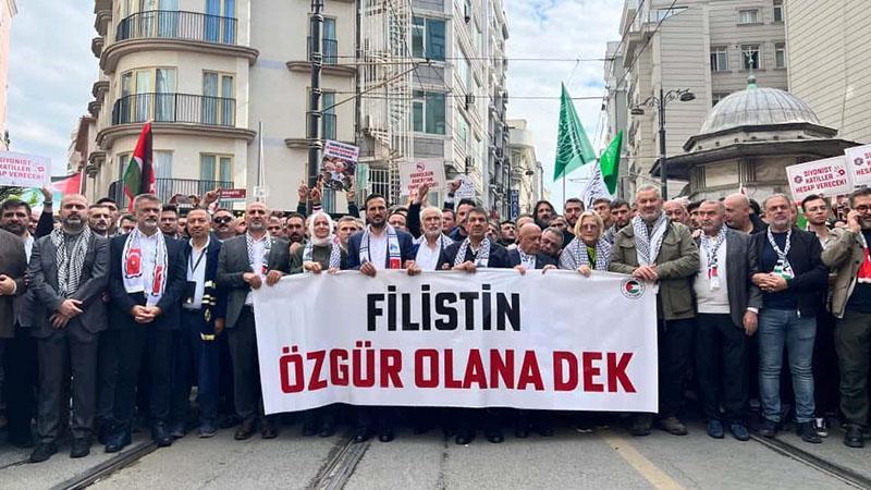 Filistin'in özgürlüğü ve Küresel Sumud Filosu'na destek için 'Filistin'e Destek Platformu' öncülüğünde Ayasofya Camii'nde öğle namazı kılan grup, 'Özgürlüğe Yürüyoruz' sloganıyla Eminönü meydanına yürüdü. Öte yandan İstanbul Boğazı'nda bir araya gelen Filistin bayraklı tekneler de Eminönü açıklarına doğru hareket etti. Yürüyüşe AK Parti Genel Başkan Yardımcısı Fatma Betül Sayan Kaya, AK Parti İstanbul Milletvekili Hasan Turan, AK Parti İstanbul İl Başkanı Abdullah Özdemir, Esenler Belediye Başkanı Tevfik Göksu, İHH Genel Başkanı Bülent Yıldırım, Filistin'e Destek Platformu Başkanı Mehmet Güney, HAK-İŞ Genel Başkanı Mahmut Arslan, Maarif Yönetim Kurulu Üyesi Ahmet Türkben ile onbinlerce kişi katıldı.