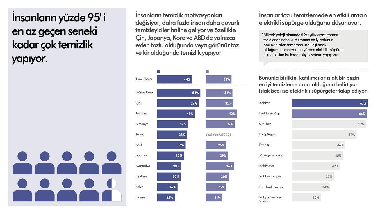 Global çapta araştırmaya katılanlar, 2020'deki yüzde 33'lük orana kıyasla, yüzde 44’lük bir oranla yalnızca evleri tozlu olduğunda veya yerde görünür toz ve kir olduğunda temizlik yapmaya motive olduğunu belirtti. Katılımcıların yüzde 56’sı temizliği rutin bir aktivite gibi gördüğünü kaydederken, yüzde 29'u, geçen yıla göre dışarıdan evlerine toz ve polen getirme konusunda endişe duyduğunu dile getirdi.