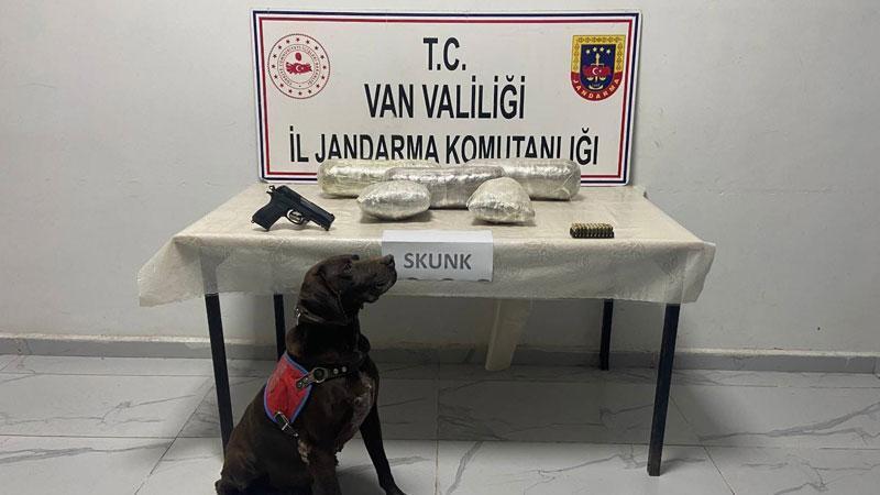 Van'ın Başkale ilçesinde durdurulan araçta narkotik arama köpeği 'Tütün' ile yapılan aramada; 4 kilo 311 gram skunk ele geçirildi.