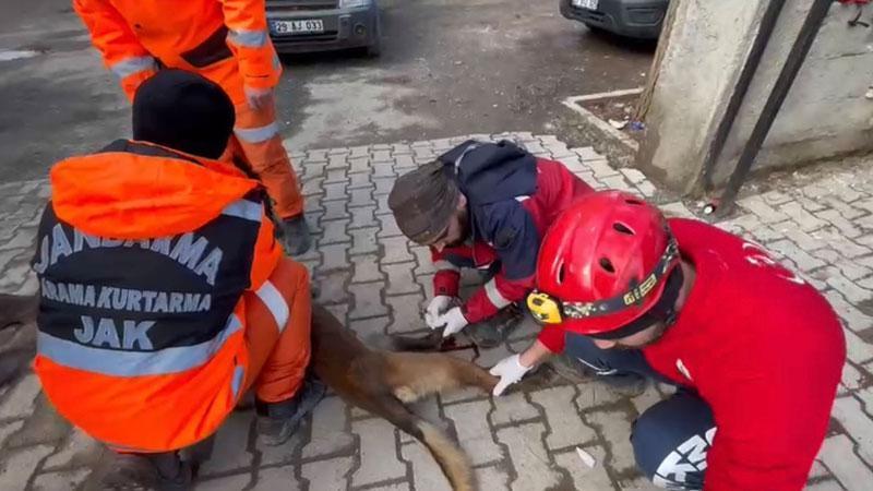 Jandarmaya ait arama- kurtarma köpeğinin arka sağ ayağında büyük bir kesi oluşmuş, kanaması da mevcuttu. Ben de acil travma biriminde olduğum için ilk müdahalesini yaparak, dikiş işlemlerini ben yaptım. Sonrasında köpek enkazda arama kurtarma çalışmasına katıldı" diye konuştu.