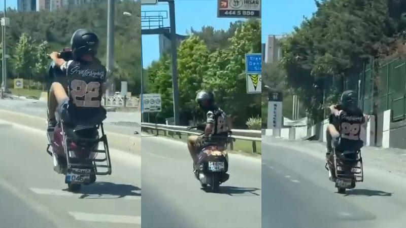Olay, dün öğle saatlerinde Şile Yolu Ümraniye yönünde yaşandı. Akan trafikte seyir halindeki motosiklet sürücüsü, uzun süre tek teker üzerinde ilerledi. Tehlikeli yolculuğu gören diğer sürücüler motosiklet sürücüsüne tepki gösterdi. O anlar seyir halindeki bir araç içerisinden cep telefonu kamerasıyla kaydedildi. Görüntülerde motosikletlinin trafikte tek teker üzerinde ilerlediği anlar yer aldı.