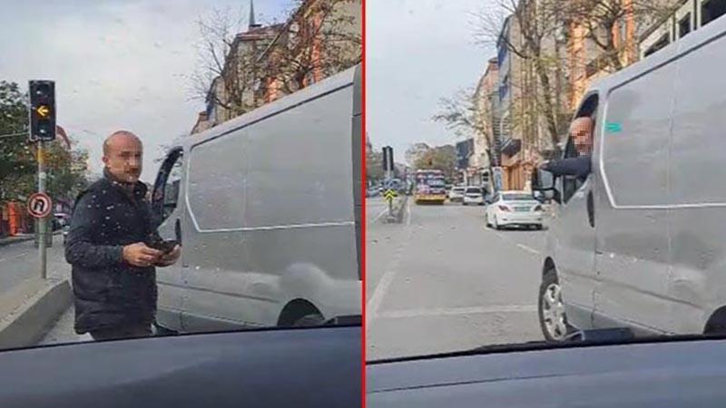 Ümraniye'de trafikte yaşanan yol verme tartışmasında hafif ticari araç sürücüsü, otomobilin önünü kesti. O anlar otomobil sürücü tarafından cep telefonu kamerasıyla görüntülendi.