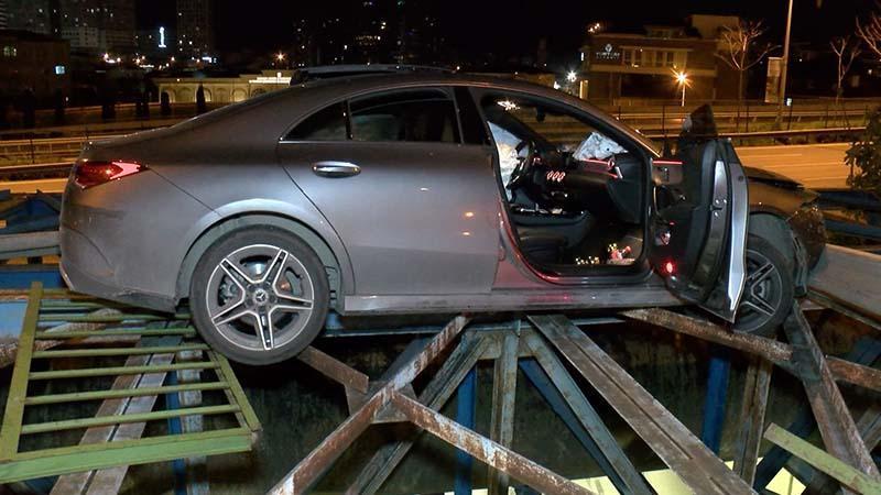 Üsküdar'da alkollü sürücünün kullandığı otomobil köprü arasında askıda kaldı