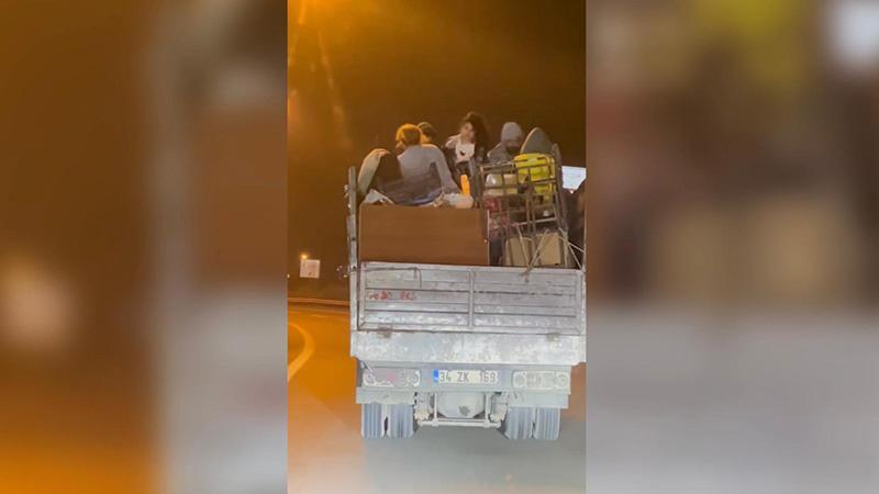 Olay, saat 23.00 sıralarında Şile Otoyolu'nda yaşandı. Seyir halindeki kamyonette taşınan eşyaların üzerinde 5 kişi yolculuk yaptı. Trafikteki tehlikeli yolculuk cep telefonu kamerasıyla kaydedildi. Görüntülerde eşyaların üzerinde oturan iki çocuk ve diğerlerinin hiçbir güvenlik önlemi olmadan yolculuk yaptığı anlar yer alıyor.