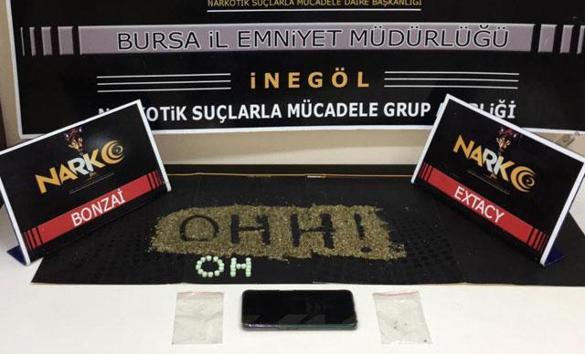İnegöl Emniyet Müdürlüğü Narkotik Suçlarla Mücadele Ekipleri, uyuşturucu ticareti yaptığı tespit edilen M.T.Y isimli şüpheliyi, takip sonunda Nuri Doğrul Caddesi üzerinde yakaladı. Şüphelinin üzerinde yapılan aramada 25.92 gram bonzai ve 24 adet ecstacy hap ele geçirildi.
