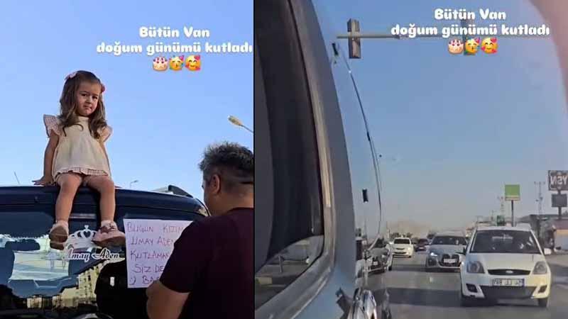 Van'da 2 yaşına giren Umay Aden için ailesi, duygulandıran bir doğum günü sürprizi hazırladı. Araçlarının arkasına 'Kızımız Umay Aden 2 yaşında, kutlamak için siz de kornaya basar mısınız' notunu asan ailenin ricası, büyük ilgi gördü. Notu gören sürücüler, kornaya basarak minik Umay Aden'in doğum gününü kutladı.