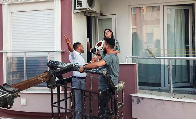 Antalya'da, Eren Mutlu (26), kiraladığı vincin sepetiyle kız arkadaşı Elif Naz'ın (21) oturduğu 2'nci kata çıkarak, evlilik teklifinde bulundu.